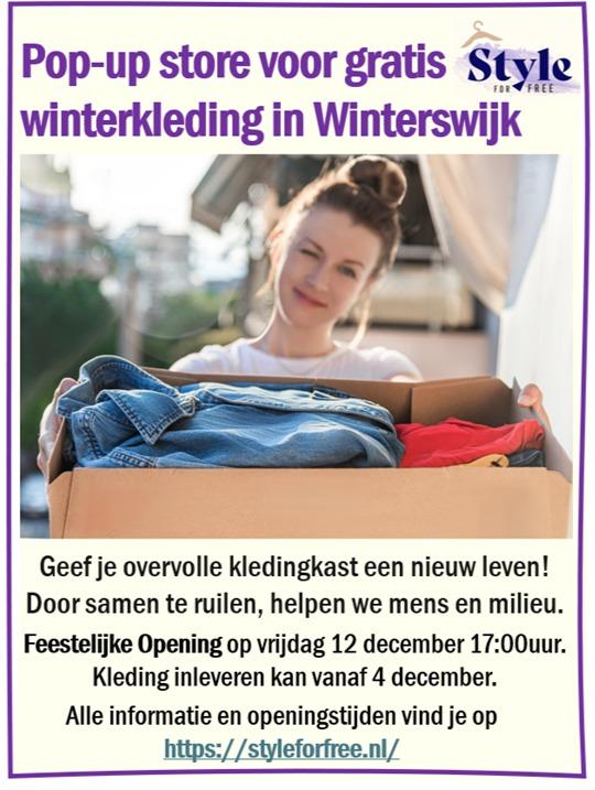 Het is ook mogelijk om kleding in te leveren en/of te ruilen. Wil jij graag winterkleding uitzoeken? Loop dan vooral even binnen. Alle info en openingstijden vind je op: https://styleforfree.nl/
